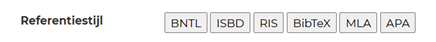 Onderaan elke bron vind je een gestandaardiseerde referentie die je rechtstreeks kan overnemen in jouw bronnenlijst. Daaronder is er een weergave van enkele andere referentie- of exportmethoden in de vorm van verschillende blokken. Zo zal je bij MLA en APA doorverwezen worden naar een pagina die de gewenste citatiemethode doorvoert.