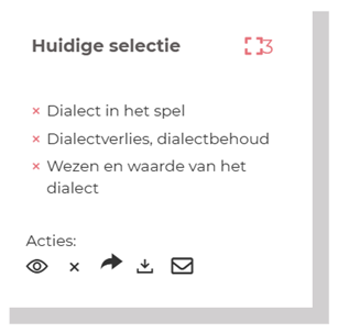 Diezelfde bewerkingen kan je ook maken wanneer je je selectie op de hoofdpagina bekijkt via het icoontje . Daar kan je ook bijvoorbeeld in bulk exporteren in verschillende bestandsformaten door op het download-tekentje te klikken (opties: PDF, CSV, ISBD, Export Ris (Zotero)).
