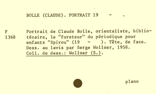 BOLLE (CLAUDE). PORTRAIT 19 -. Portrait de Claude Bolle, orientaliste, biblio- técaire, le "fureteur" du périodique pourenfants "Spirou" (19 - ). Tâte, de face.Dess. au lavis par Serge Wollner, 1958.Coll. de dess: Wollner (S.). plano.
