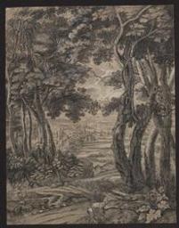 Landscape with trees in the foreground [Drawing] / attributed to Lucas Achtschellinck. - [17th century]. - 1 drawing : pen and brown ink, grey wash, heightened with white gouache ; 465 x 364 mm. - Watermark.