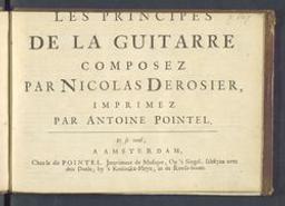 Les principes de la guitarre composez par Nicolas Derosier. - X, [2] p : mus. ; 8vo oblong. - RISM B VI, p. 261. - Fort rogné, dernières paginations non visibles (?). Relié avec Fétis 5.488 A : "Methode facile pour apprendre a chanter en musique. Par un celebre maistre de Paris. Paris : Christophe Ballard, 1696".