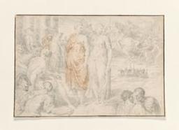 Mythological scene with a battle scene in the background [Drawing] / drawn by Abraham van Diepenbeeck after Primaticcio, Nicolò dell'Abbate or their school. - [drawn after a painting in the castle of Fontainebleau or in another noble residence in the vicinity of Paris], ca. 1631-32. - 1 drawing : black and red chalk, possibly a counter-proof of another drawing, framing lines in iron gall ink ; 225 x 335 mm.