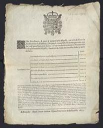 [1677 09 10] Son Excellence, a pour & au nom de Sa Majesté. ordonné. que sur les papiers blancqs à escrire, qu'on voudra faire entrer és provinces de l'obeyssance de Sa Majesté, seront levez. les droits cy-après declarez. - A Bruxelles : chez J. Theodor Anthoine Velpius, imprimeur de Sa Majesté, 1677. - 1 placard ; (42 x 33 cm).