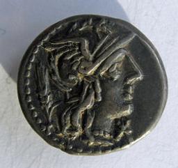 Hoofd Roma naar rechts, links korenaar, rechts onder kin ?, parelrand