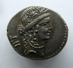 Hoofd vrouw naar rechts, met eikenkrans en diadeem, links T II (T omgekeerd) naar onder, parelrand