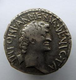 Hoofd Marcus Antonius naar rechts, links Armeense taria, parelrand