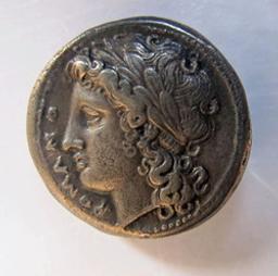 Hoofd van Apollo met lauwerkrans naar links; parelrand