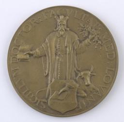 Un érudit, coiffé d'un un chapeau, debout de face, tient un livre ouvert dans la main droite et un bouquet de fleurs dans la main gauche, un taureau couché à ses côtés et un blason portant les armes de l'ancienne Université de Louvain (1425-1797) devant lui couvrant ses pieds.