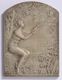 Onder een eik zit een vrouw die haar handen uitsteekt naar de borstbeelden van koningin Elisabeth en koning Albert I. In de verte een landschap met bomen en het Justitiepaleis van Brussel.