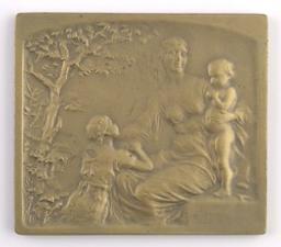 Une femme assise, vers la gauche, maintient debout à côté d'elle un jeune enfant nu et accueille une fillette. Un arbre à gauche