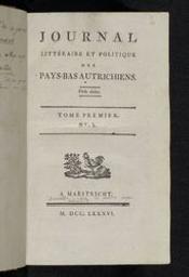 Journal littéraire et politique des Pays-Bas autrichiens. Tome premier. N°. I. [-numéro XXVII]. - A Maestricht [i.e. Bruxelles] : [s.n.] [i.e. M. Lemaire], 1786. - [2], 5, [3], 442 [= 438] ; 8vo. - Sig. [p]1 A4 A9 B-E8 F2 F-I8 L-2E8. - Sgard, Dict. des journaux, 698-699, n°766: imprimé à Bruxelles, peut-être par M. Lemaire. - F.bl.(?) A4 manque. Notes ms. Dans un recueil factice. Ex-libris et prov. ms.: Charles Van Hulthem. Cachet: Bibliotheque Royale - Fonds Van Hulthem.