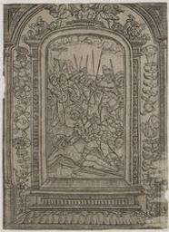 Series of passion scenes not recognised as such by Hollstein: similarities in architectural frame, in border with flowers and columns and in dimensions; no monogram; slightly damaged at the edge.