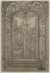 Christ on the Cross [Print]. - c. 1519-1520. - 1 print : engraving ; 116 x 83 mm ; Folio. - In a border with flowers and columns. Iconclass code 73D643. Christ on the cross with Mary, John, Mary Magdalene (and Longinus). Series of passion scenes not recognised as such by Hollstein: similarities in architectural frame, in border with flowers and columns and in dimensions; no monogram. - S.II 5789.