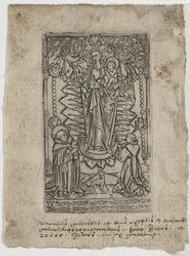 The Virgin on the Crescent [Print]. - ca. 1519-1520. - 1 print : engraving ; 107 x 64 mm ; Folio. - 'Immaculata', 'Purisma': Mary (with Christ-child), standing on a crescent moon, descending from heaven, exempt from original sin; with St. Dominic(us) Guzman (book, dog, globe) and another monk. Monogram bottom centre. Iconclass code; 11F232. - R-2009-16091.
