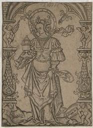 St. Mary Magdalen [Print]. - 1 print : engraving ; 110 x 74 mm ; Folio. - Iconclass code 11HH(MARY MAGDALENE). St. Mary Magdalene holding a jar of ointment; between two columns with an angel. Mark on a tablet bottom right; Collector's mark L.567 at the back: 'CH. PROTECTOR MEUS' = Collection D'ARENBERG; no monogram S. - S.II 132730.