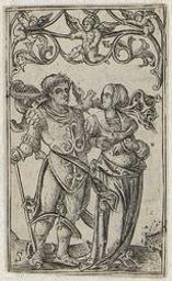 A Gentleman and a Lady Walking to the Right [Print]. - 1 print : engraving ; 67 x 40 mm ; Folio. - Iconclass code 33C231. Couple of lovers arm in arm: a gentleman and a lady heading to the right under an arabesque of foliage with cherubs and with a dove between them. Monogram bottom left corner; collector's marks L.5h and L.5e (Albertina) at the back. - S.V 84610.