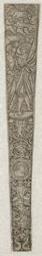 Scabbard with Lady and Standard-Bearer at Top [Print]. - ca. 1519-1520. - 1 print : engraving ; 203 x 16 mm ; Folio. - Iconclass code 45D12. Scabbard with a lady and standard bearer at top. One of a pair (as described in H. XIII, no. 458 and 459, p. 223); two collector's marks of British Museum at the back [L.305 (duplicate) and L.302 (with date 1873)] and handwritten registration number 'PIII 82184' and abbreviation 'dupl.'; monogram reversed S at the feet of the gentleman. - S.III 68821.