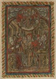 Christ Before Annas [Print]. - c. 1519-1520. - 1 print : engraving colored ; 144 x 90 mm ; Folio. - (style of). Iconclass code 73D321. Christ is brought before Annas; Christ is lead away to Caiaphas (tondo). Series of 13 prints (S.V 89065-077) related to Master S (prints in reverse): see H. XIII, nos. 153-154, p. 136 and Hébert, II, nos. 3311-3319, p. 302-303; the tendril ornament in the upper right and left corners however is different, as is the architectural arch in which the tondo is embedded; coloured by hand; no monogram. - Hébert, II ; no. 3313, p;. 302-303. - S.V 89066. - William H. Schab, New York, 1964.