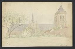 Collégiale de Saints-Pierre-et-Guidon à Anderlecht [avant transformation de la tour (en 1898)] [Drawing]. - 1886. - 1 drawing : mine de plomb + crayon Conté + aquarelle ; 17,5 x 27,2 cm. - R-2009-26376.