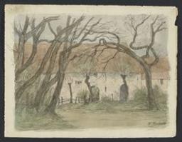 Grande maison campagnarde derrière un bouquet d'arbres [Drawing]