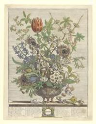 The Twelve Months of Flowers: February [Print]. - s.l : s.n, 1730. - 1 print : Etching and engraving, hand coloured ; 412 x 305 mm; 435 x 337 mm. - Arrangement of 35 varieties of flowers in a decorative vase. From a series of 13 prints. - T. CLAYTON, The English Print (1688-1802), New Haven and London, 1997, p. 130-134. - F-2016-2.