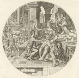 Samson and Delilah [Print]. - s.l : s.n, ca. 1560. - 1 print : engraving ; 260 mm diameter. - (The story of Samson). - NHD (Van Heemskerck) 89; NHD (Galle Ph.) 16. - S.I 1561.