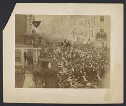Cortège du transfert des cendres d'Henri (Henry) Vieuxtemps, le 28 août 1881 à Verviers. Eugène Ysaÿe porte le violon de Vieuxtemps en tête du cortège [Image fixe = Afbeelding] / RW. Man [?]. - Verviers : [Editeur non identifié], [Date de publication non identifiée]. - 1 photogr. pos. ; 26,7 x 32,2 cm. - La photographie est originale est issue d'un don de Madame Jean Vieuxtemps. Fonds Eugène Ysaÿe.